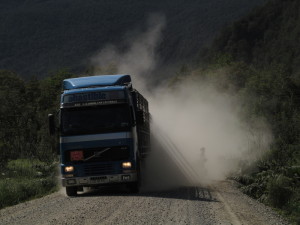 Ein anderer Plan ist es, die bisher existierende Schotterstraße zu asphaltieren. Und davon bekommen wir bereits etwas mit. Auf den folgenden 70km bis nach La Junta wird fleißig gebaut. Wir teilen uns knackige, enge Steigungen mit mit Material beladenen Lastfahrzeugen. Klar ist, unsere Anwesenheit stört die Fahrer. Abgebremst und gewunken wird nur von Zweien. Die Restlichen rasen vorbei. Steinchen springen, wir müssen ausweichen und sind am Tagesende von oben bis unten eingestaubt. Unter den Reifen wegrutschend fühlen wir alle Arten verschiedenster Gesteine in allen Größen. An Material wird genommen, was in der Gegen vorhanden ist. Am Dööfsten sind kartoffelgroße Kieselsteine direkt aus dem Flussbett nebenan. Wir halten den Lenker mit voller Kraft fest, versuchen das Fahrrad unter Kontrolle zu behalten. Die Räder entwickeln ein Eigenleben. Es ist ätzend! Da wir permanent auf den Boden achten müssen, sehen wir viel Schotter, können jedoch nichts zu der Natur um uns herum berichten.