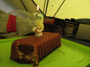 An Hardys 30. Geburtstag kommt wenigstens ein paar Mal die Sonne raus, das hebt die Stimmung! Bei immer mal wiederkehrendem Regen und Hagel holpern wir voran durch dichten, schief gewachsenen, bemoosten Wald auf der vorletzten Etappe in Richtung Villa O’Higgins, bis wir ein altes, verfallenes refugio erreichen. Wir zelten dann lieber hinter der Hütte. Obwohl das Wetter so scheiße ist, genießen wir es aus vollen Zügen hier zu sein! Gigantisch ist der Regenwald und kurze Momente höchsten Glücks kommen auf, wenn dann doch mal kurz ein Stück Berg, manchmal sogar mit Schnee drauf zwischen den Wolken hervorlugt. Dann kann endlich der schöne Teil des Tages beginnen: Es gibt Kuchen und Geschenke, einen Mate-Becher, aus dem Hardy von nun an gemütlich am Tagesende schlürft.