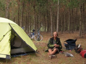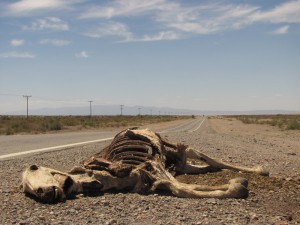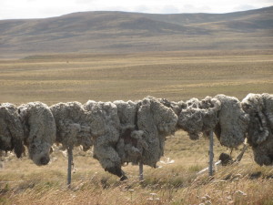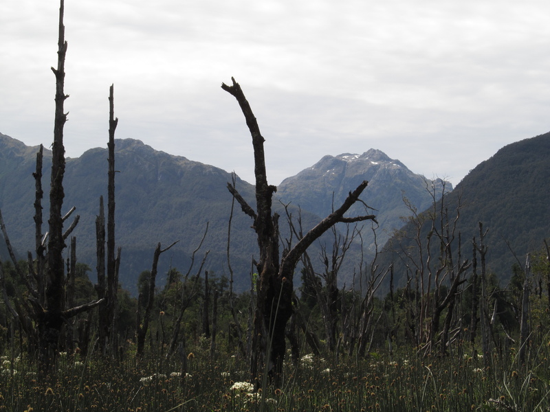 Der Abschnitt vor Coyhaique ist geprägt durch Brandrodung. In den 40er Jahren soll es hier große Waldbrände gegeben haben, deren Zeugen, die grauen, verstümmelten Überreste einstiger Baumriesen, wir noch wahrnehmen können. Zwischen ihnen grasen Kühe und Schafe auf den entstandenen Weideflächen. Diese fressen sich zu beiden Seiten der Piste immer weiter in den Wald hinein, um dann penibel mit Stacheldraht umzäunt zu werden. Mich würde interessieren, wieviel Prozent der Carretera bereits eingezäunt sind! Für uns ist es schwierig einen Schlafplatz zu finden. Manchmal gibt es Gatter, die nicht mit einer Kette verschlossen sind. Die öffnen wir und verschwinden in den Büschen. So auch heute. Leider zündet bald Jemand just auf der Nachbarparzelle in einem Haufen gerodeter Pflanzen einen Schwelbrand an. Der Wind steht voll in unsere Richtung, wir werden die ganze Nacht hindurch eingeräuchert.