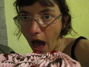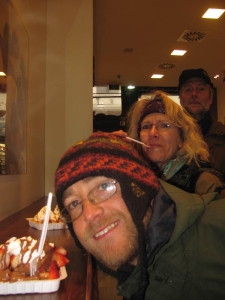 An Hardys 30. Geburtstag kommt wenigstens ein paar Mal die Sonne raus, das hebt die Stimmung! Bei immer mal wiederkehrendem Regen und Hagel holpern wir voran durch dichten, schief gewachsenen, bemoosten Wald auf der vorletzten Etappe in Richtung Villa O’Higgins, bis wir ein altes, verfallenes refugio erreichen. Wir zelten dann lieber hinter der Hütte. Obwohl das Wetter so scheiße ist, genießen wir es aus vollen Zügen hier zu sein! Gigantisch ist der Regenwald und kurze Momente höchsten Glücks kommen auf, wenn dann doch mal kurz ein Stück Berg, manchmal sogar mit Schnee drauf zwischen den Wolken hervorlugt. Dann kann endlich der schöne Teil des Tages beginnen: Es gibt Kuchen und Geschenke, einen Mate-Becher, aus dem Hardy von nun an gemütlich am Tagesende schlürft.