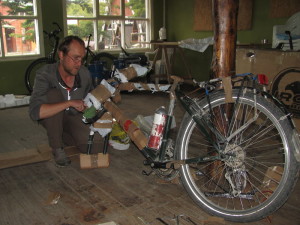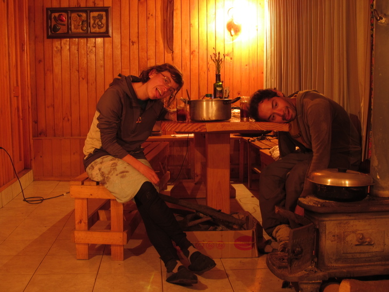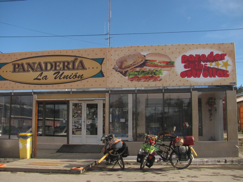 Die erste Etappe der Carretera Austral ist geschafft! Wir gönnen uns einen Ruhetag und bleiben bei Boris, unserem warmshowers-Gastgeber, in seiner kleinen Holzhütte. Gerade sind drei weitere Radler hier, die sich des Nachts den Küchenboden teilen. Wir bauen das Zelt im Vorgarten auf und verbringen zwei schöne Tage mit Boris, Mattjis, Nicolas und Mauricio. Dem einzigen Radladen weit und breit, der bicicleteria figón, statten wir natürlich einen Besuch ab. Doch können wir aufgrund von schlechter Betreuung, überhöhten Preisen und fehlender Kompetenz nur davon abraten! Aufgrund eines nicht als Ersatzteil aufzutreibenden defekten Industrielagers in meinem Freilauf entscheiden wir uns eine neue Hinterradnabe einbauen zu lassen. Der Mechaniker schafft es doch tatsächlich einen leichten Höhenschlag, keine zentrale Lage auf der Achse und zu wenig Speichenspannung einzubauen. Aus Hardys Hinterrad kriegt er nur den Seitenschlag heraus. Es gibt noch nicht einmal einen Ständer, die Räder werden einfach kopfüber auf den Boden gestellt. Zum Glück hatten wir Plastiktüten über unsere Ledersättel gezogen, sonst wären die zerkrazt. Hardy fordert Nacharbeit bei den Höhenschlägen und bekommt als Antwort des Mechanikers „ach, das sind doch nur ein paar Millimeter!“ Daraufhin geraten die Beiden in eine heftige Diskussion, bei der der Mechaniker am Ende einfach geht. Hardy trat da wohl aufs Ego… Am Ende bezahlen wir nur das Material, nicht die Arbeitszeit und verlassen gefrustet den Laden. Hardy arbeitet bestimmt noch zwei Stunden nach.