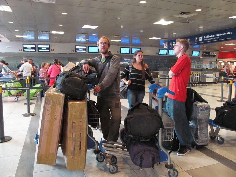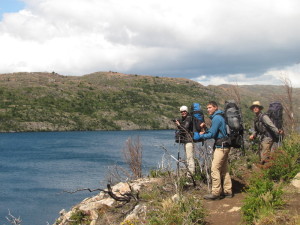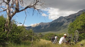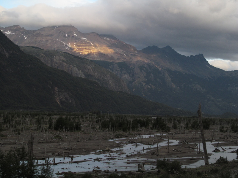 Nach dem Grenzschild Argentiniens wird es arg, denn die Piste verwandelt sich in einen schmalen Wanderweg, der über Stock und Stein, Baumstämme, zerstörte Brücken, durch Bäche und Schlammfelder führt. Das Gewicht sowie die Vorderradtaschen unserer Fahrräder machen sich negativ bemerkbar. Die Spanier, mit ihren leichten Packtaschen, sind uns klar im Vorteil. Über Stunden zieht sich diese „Wanderung“ hin, bis wir endlich den Lago de Desierto unter uns sehen und beim argentinischen Grenzposten angekommen sind. Die Zelte der Anderen stehen bereits. Es ist nach 18h, unsere nassen Füße sind super kalt. Es windet. Gerade, als wir unser Nachtlager aufbauen wollen, sehen wir sich in der Ferne ein Boot nähern. Wir halten inne und wollen versuchen uns jetzt schon mit ans andere Ende mitnehmen zu lassen. Bereits in Villa O’Higgins haben Tickets für eine Bootsfahrt gekauft, da wir fälschlicherweise gehört hatten, es verkehre nur eine Firma. Deren großes Boot sollte mal wieder kaputt sein, so dass nur ein kleines mit wenigen Plätzen eingesetzt würde. Für dieses Boot hatten wir leider erst Tickets in 1 ½ Tagen bekommen und uns auf eine Wartezeit eingestellt. Eine Alternative, die es aber insbesondere nach dem Tag heute zu vermeiden gilt, wäre eine weitere heftige Radtrageaktion in 20 Stunden um den See herum. Dieser Wanderweg soll aber bei weitem in noch schlechteren Konditionen sein!