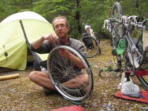 Zu allem Überfluss tut sich an Hardys Fahrrad eine neue, besorgniserregende Baustelle auf: Wir bemerken einen Riss in der Felgenflanke seiner Hinterradfelge. Eine Folge seines sportlich-flotten Fahrstiles auf den Abhängen der Schotterpisten der vorangegangenen Tage – oder auch „radeln wie Sau“, plus die bisher abgeradelten 32.500km. Seit Costa Rica, also 1 ½ Jahre lang, trage ich eine Ersatzfelge „nur für den Fall“ mit mir herum. Bewährt sich diese Vorkehrung nun „endlich“?! Doch Hardy hat keine grosse Erfahrungen mit dem Einspeichen eines neuen Rades und möchte dies am Liebsten mit professioneller Unterstützung im drei Tage entfernten Coyhaique tun. Momentan stagniert der Riss. Es wird vorsichtig weitergeradelt und nun vor jedem Schlagloch abgebremst.