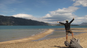 Gegen Mittag brechen wir auf. Das Wetter zieht all seine Register: Rückenwind dreht in Gegenwind, Sonne wechselt sich mit Nieselregen ab. Es geht am Ufer des Sees General Carrera weiter knackig hinauf und hinab. Dann folgt mal eine Gerade mit festem Belag, auf der wir Geschwindigkeiten von bis zu 20km/h erreichen! Am Tagesende kämpfen wir uns wieder mühsam hinauf, auf Steilhängen um die Lago Negro herum und bauen das Zelt in einem sonnigen Moment mit fast keinem Niesel am Ufer des ruhigen Sees Bertrand auf.