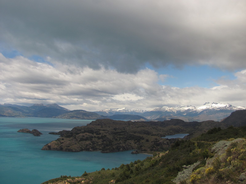 Am Folgetag erreichen wir nach vielem Hoch und Runter den großen See General Carrera, eine gigantische Wasserfläche, die in der Sonne unbeschreiblich türkis leuchtet. Die tieferen Wasserstellen heben sich vom türkis in dunkelblau ab.