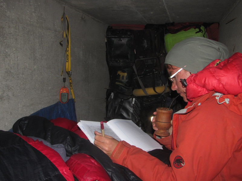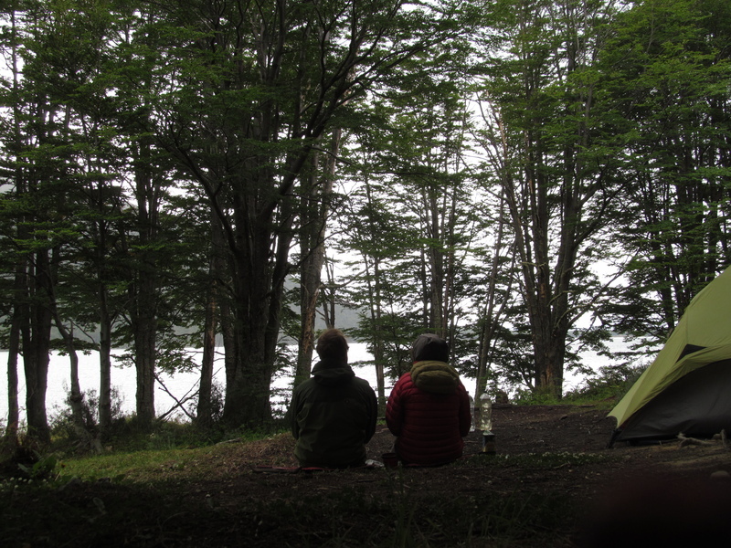 Wir haben großes Glück, denn es kommt das Huemul angefahren, das große Boot unserer Firma, die Crew macht gerade Testfahrten. Mit vielen Scherzen quatschen wir uns on Board und können es nicht fassen, als wir kurz darauf in den weichen Sitzen windgeschützt drinnen sitzen und Gletscher an uns vorbeiziehen sehen! Nach 20 Uhr kommen wir am Südende des Sees an und sind einfach nur noch fertig. „Ist mir egal was das kostet, ich will auf den nahen Campingplatz, ich will auf der Stelle Schluss für heute machen!“, mault Hardy. Im Windschutz zwischen Bäumen, geduscht und mit fertigem Essen begrüßen wir erstaunt Forrest. Der amerikanische Wanderer ist weiter gelaufen, um den Lago de Desierto herum, bis er sein aufblasbares Kajak im Fluss einsetzen und herpaddeln konnte. Vergnügt und müde lassen wir uns zu dritt Nudeln mit Brot schmecken und den neuen Mate-Becher kreisen.