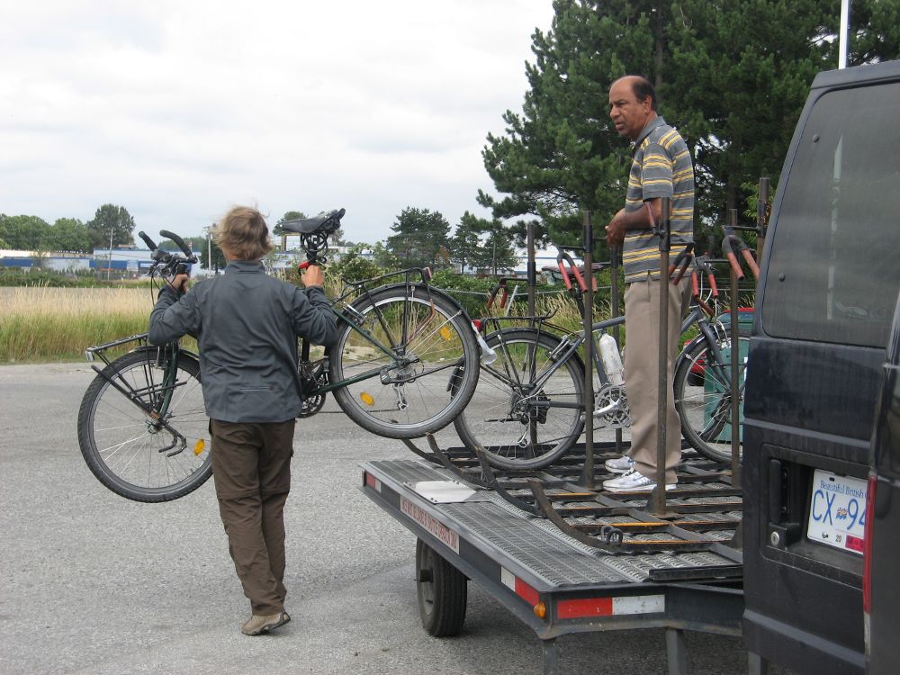 Um zum Pier zu gelangen, müssen wir das riesige Vancouver durchqueren, d.h. 40 km Stadtverkehr. Dafür brauchen wir drei Stunden. Ich mag es nach wie vor nicht in urbanen Räumen zu radeln. Für mich bedeutet dies einen großen Stressfaktor. Zum Glück haben wir einen Radwegestadtplan dabei, so dass sich die Strecke letztendlich als durchaus machbar heraus stellt. Vor dem George Massey Tunnel warten wir eine Stunde auf ein Fahrradtaxi. Dieser darf nur mit dem Auto durchquert werden. Zusammen mit dem muffeligen und unfreundlichen indischen Fahrer laden wir die Räder auf den Anhänger. Wir sind überrascht, das Taxi ist umsonst.