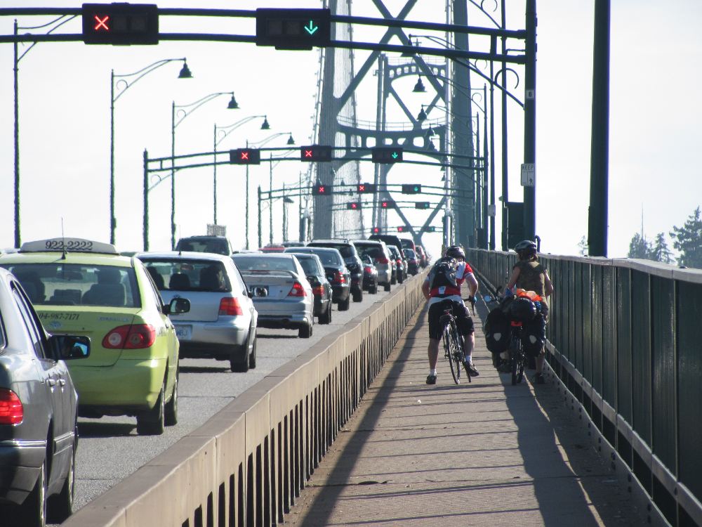Eine weitere Fährfahrt trennt uns von Vancouver. Ich bin immer noch erkaltet und quäle mich die Steigungen hoch. Wir schaffen diese ganz knapp. Vom Anleger in die Innenstadt gibt es ein interessantes Radwegesystem: Es geht über den Highway. Dessen Seitenstreifen wurde einfach zum Radweg umbenannt. Es fühlt sich an, als fuhren wir auf dem Berliner Stadtring. Auf drei Spuren brausen die Autos und Lastwagen an uns vorbei. Die Sonne burnt. Im Schatten einer Brücke machen wir eine Verschnaufpause. Insgesamt fahren wir ungefähr eine Stunde auf dem Highway. Die Ausfahrt zum Stanley Park ist endlich die unsere! Um ihn zu erreichen, müssen wir über die große Lyons Gate Bridge fahren. Eine lange, gebogene Brücke, auf der es erst einmal bergauf geht. Zum Glück gibt es auch hier eine Fahrradspur.