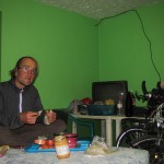 „Ihr seit aber spät dran, ich habe schon gestern Abend auf euch gewartet.“ Darauf sind wir gefasst, hatten nämlich von diesem Spruch gehört. Anscheinend sagt Coco das zu allen Radlern, die ihn besuchen kommen. Wir setzen uns zusammen und erzählen von unserer Reise. Die angebotene kalte Cola wird gierig in einem Zug geleert. In sein selbst illustriertes Gästebuch müssen wir uns natürlich auch eintragen. Stolz zeigt uns Coco, welche anderen Reiseradler ihn dieses Jahr schon besucht hatten. Lustigerweise lesen wir Nachrichten von Radlern, die wir auf dieser Tour getroffen hatten oder von denen wir während der Vorbereitung lasen. Nach einer Weile sind bei mir die Gesprächsthemen erschöpft und ich drängle aufs Weiterfahren. Es bleiben immer noch 20 km Schotterpiste.