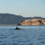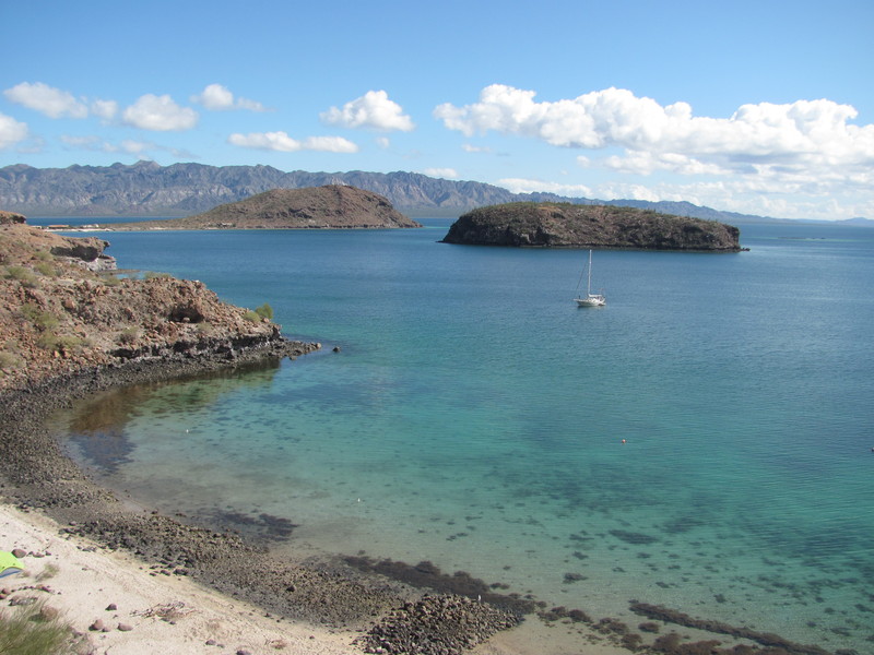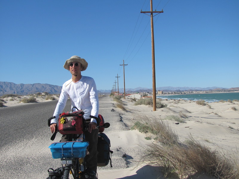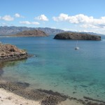 Wir sehen den Vulkan las tres Virgenes, als wir die Hügelkette überwinden und auf einer kaktusbestandenen Ebene dahin rollen. Dann geht’s runter und wieder rauf, wir sind es gewöhnt und es macht uns wenig aus. Nur der Gegenwind nach den Hügeln fällt negativ auf. Nun können wir den Golf von Kalifornien sehen, die fantastisch blaue Sea of Cortez.