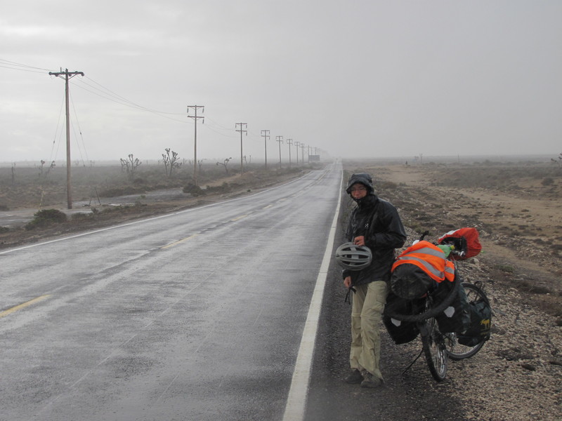 Mit dem Einradeln in die Region Baja California Sur, übertreten wir den 28. Breitengrad. Dieser wird von einem riesigen Adlermonument markiert. Auf der folgenden Strecke bis nach Guerrero Negro erleben wir wieder Starkregen. Kein Haus oder Baum ist in Sicht. So stellen wir uns einfach mit Regenjacke an den Straßenrand, drehen den Rücken zum Wind und warten ab. Für die Regenhose ist es eh schon zu spät. Zum Glück trocknen die durchgeweichten Klamotten schnell.
