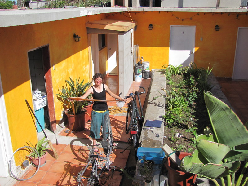 In Guerrero Negro finden wir das nette, familiäre Minihotel Asunción, für nur 10 Euro. Im Innenhof putzen wir lang die völlig verschlammten Räder. Uns tut die Hotelmami leid, ständig muss sie unseren Dreck weg putzen. Wir können sie nicht davon abhalten es später selbst zu tun.