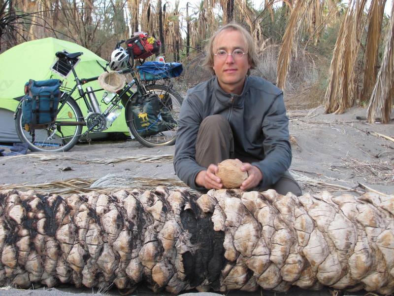 Auf den Campingplatz wollen wir nicht, nach duschen ist uns auch nicht zumute, (schon interessant wie sich die Bedürfnisse verändern können…). Also verziehen wir uns in einen abgebrannten Palmenwald. Bis auf den unterschwelligen Brandgeruch und die schwarzen Stämme ist es ganz schön hier, alles voller Palmen und Sand. Es ist Feigenzeit und wir schlingen die energiereichen frischen Früchte hinunter. Dazu gibt’s eine von Hardy frisch geöffnete Kokosnuss. Mensch ist das lecker, mensch geht es uns gut!