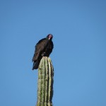 Mit einen wunderschönen letzten Blick vom Rücken einer der Hügel verabschieden wir uns vom Golf von Kalifornien, als die Straße in Ligüi ins Hinterland abknickt. Schweißtreibend windet sich die Piste hinein in die Sierra de la Giganta. Tafelberge und schroffe Schluchten bilden ein tolles Panorama. Auf den folgenden 30 km kann ich die Steigungen wirklich nur als gigantisch beschreiben. Geier sitzen hoch oben auf den Spitzen der Kakteen und linsen zu uns herunter. Es ist, als behielten sie uns stetig im Auge und warteten ab wann wir mit hängender Zunge wohl endlich schlapp machen würden.