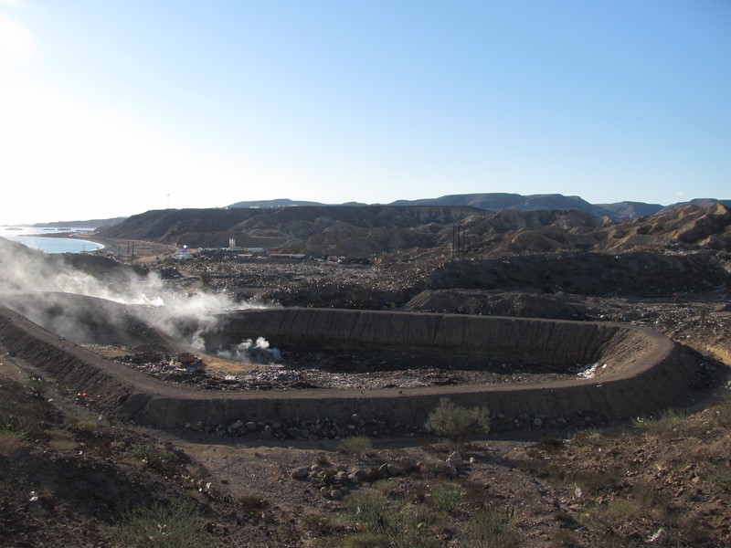 Wir sind kurz vor Santa Rosalia und es ist Zeit Schluss zu machen. Die Dunkelheit naht. Jedoch befindet sich der einzige Platz, der sich finden lässt auf einem Berghang oberhalb der städtischen Müllkippe. Einer unserer schlechtesten Zeltplätze! Wir sehen Kinder über den Müll springen, drin spielen und Erwachsene jenen sortieren sowie hier und dort mal einen der Haufen anzuzünden . Naja, gleich ist es dunkel, nur der Geruch nervt etwas. Hmmm, der Wind weht auch noch in unsere Richtung!