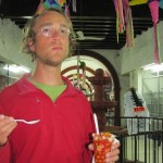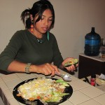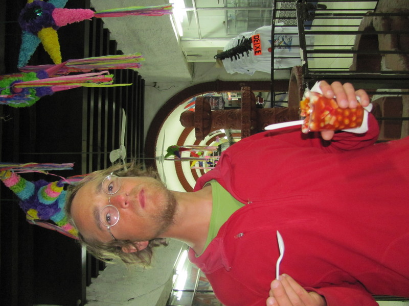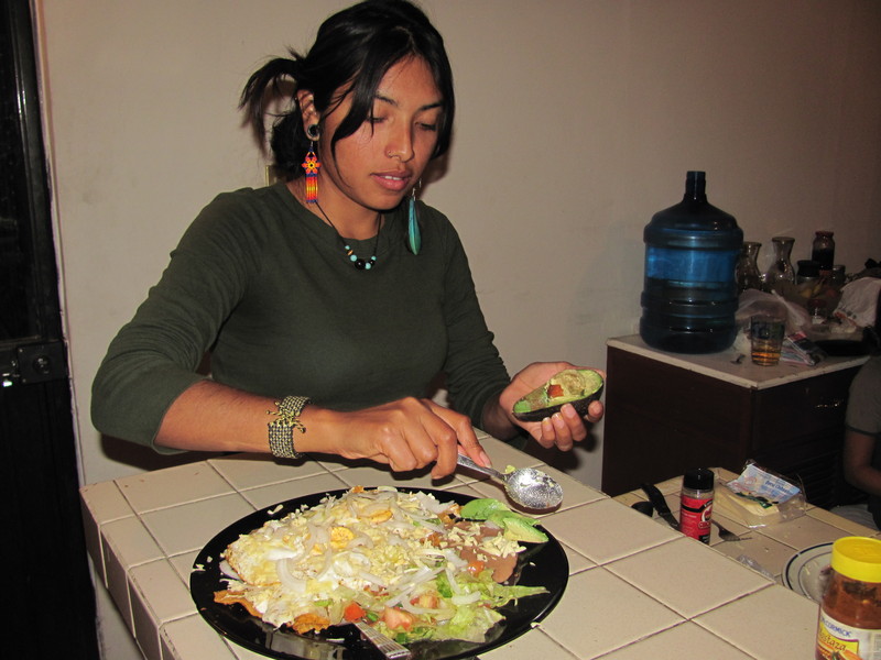 An unserem letzten Abend kocht Nallely mexikanisch, sie will sich für unseren vorherigen mitteleuropäischen Abend, Kartoffelpüree mit Senfeiern, revanchieren. Wir kommen in den Genuss von sehr leckeren chilaquiles. Das sind totopos (Tostadasdreiecke, also geröstete dreieckige Tortillafladen), die in einer scharfen Sauce weich gemacht werden. Darüber kommen zwei Spiegeleier. Als Beilage gibt es natürlich Bohnenmatsche und Salat.