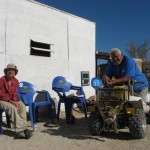 Am nächsten Tag treffen wir Coco. Er ist wirklich ein Unikum. Auf einem staubigen Platz an einer kleinen Straßenkreuzung mitten in der Wüste an beschriebener Mörderpiste hat er Wohnwagen und eine Art Haus gebaut und verkauft dort Cola und Bier. Umgeben ist das ganze Areal von einem Drahtzaun, an dem hunderte von leeren Bierdosen befestigt sind, die im Wind ein irres klirrendes Geräusch erzeugen. Coco sagt, er hat sie aufgehängt, um etwas zu hören, da es so krass ruhig hier in der Wüste sei. Unterhalb der Knie fehlen ihm beide Beine, auf selbst genähten Reifengummischuhen läuft er auf seinen Beinstümpfen umher oder braust mit seinem Quad durch die Gegend. Er begrüßt uns mit den Worten: