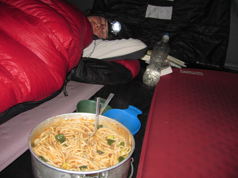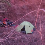 Nach einigem Suchen, finden doch einen versteckten Schlafplatz. Des Nachts kommt uns eine Stute mit ihrem neugierigen Fohlen besuchen. Jenes möchte gern in unser Zelt hinein beißen, wird jedoch kurz zuvor von Hardys lauten Rufen davon abgehalten und verscheucht. Ich sehe eine dicke fette haarige Vogelspinne im Gras krabbeln. Unsere erste lebendige.