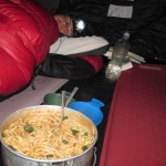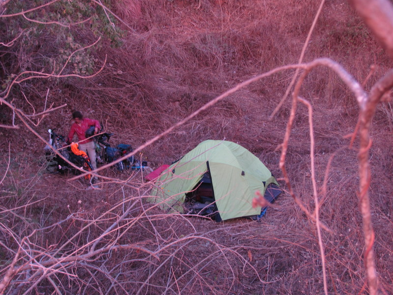 Die Schlafplatzsuche gestaltet sich etwas kniffelig. Die Autobahn beginnt. Doch finden wir ein Tor und schieben die Räder aufs Weideland. Diesmal können wir sogar ein kleines Feuerchen machen. In der Nacht wird es kalt. Wir schlafen im geschlossenen Schlafsack und frieren dennoch ein Wenig. Am Morgen haben wir Minusgrade. Der Boden ist mit Raureif überzogen.