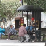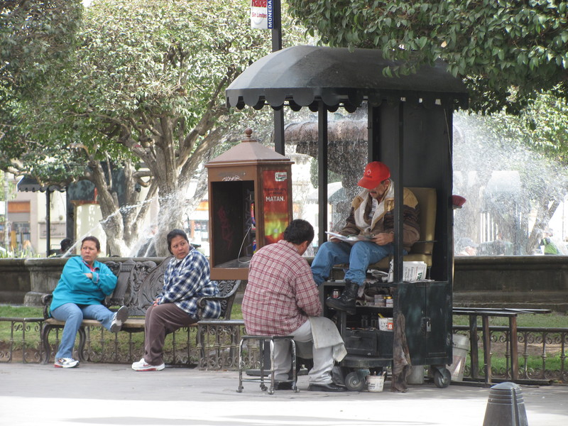 herum sitzen Männer in ihren kleinen Ständen und bieten ihre Kunst als Schuhputzer an. Wiederum zumeist Männer sind ihre Kunden. Mit viel Ausdauer und Hingabe werden ihre Cowboylederstiefel gewienert. Mit ihren Bauchläden transportieren die Mexikaner unterschiedlichste Waren. Diese werden lautstark rufend angeboten: Kaugummi, Zigaretten und kleingeschnittenes Obst in vorbereiteten Plastiktüten, welches noch mit Limettensaft und Chilesosse verfeinert wird. Eine Geschmacksexplosion, aber die Leute hier stehen darauf.