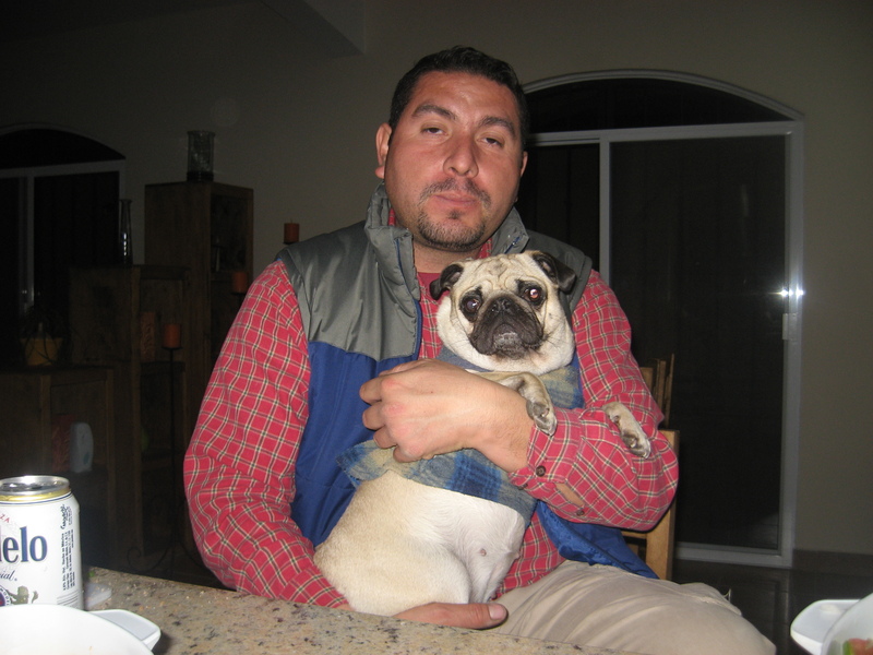 Später am Abend kommt auch Jorge-Luis nach Hause und fletzt sich zu uns aufs Sofa. Wir lernen sofort wie hier Hunde von ihm geschätzt werden. Jorge-Luis bevorzugt ganz offensichtlich den kleineren Mops Yoda. Dieser wird die ganze Zeit von ihn bemuttert. Beide schmatzen und schnurren. Wir finden’s ekelig, wie er mit dem Hund auf dem Arm das Essen teilt. Ein Bissen der Stulle für ihn, ein Bissen für den Hund … uns tut ein bisschen Frida leid, wer hier an erster Stelle steht ist klar.