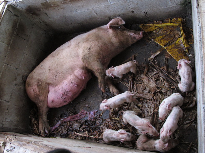 Frisch geschluepfte Ferkel und 'ne muede Sau.