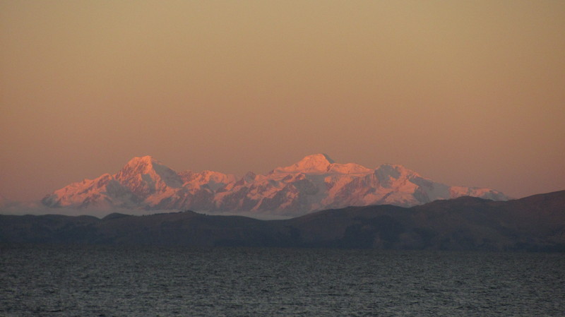 Cordillera Real und Titicacasee im Morgenrot.