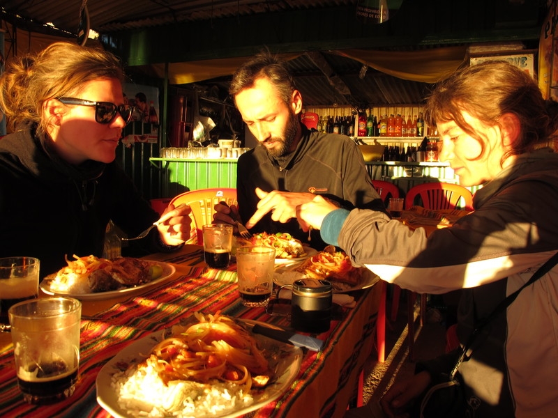 Lena, Hardy und Alena beim abendlichen Forellenessen und Biertrinken in Copacabana.
