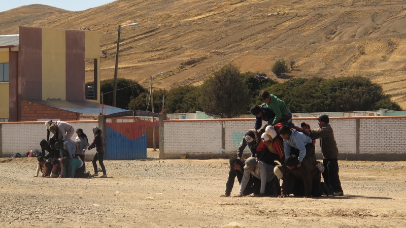 Schueler versuchen eine Pyramide zu bauen. Wer nicht schnell genug ist, bekommt vom Lehrer eines mit der Rute auf den ausgestreckten Hintern.