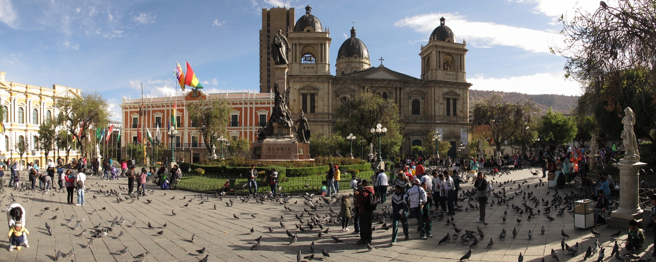 La Paz: Plaza Murillo mit Kirche und Regierungsgebaeuden drum herum und vielen vielen Tauben...