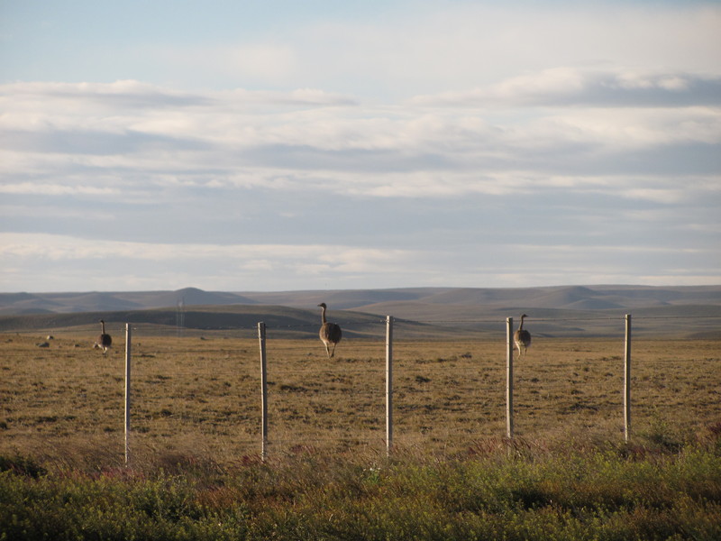 Kleine Straeusse (Nandus) rennen durch die Pampa.