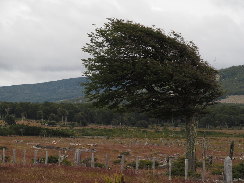 Windschiefe Baeume auf dem Weg nach Punta Arenas.