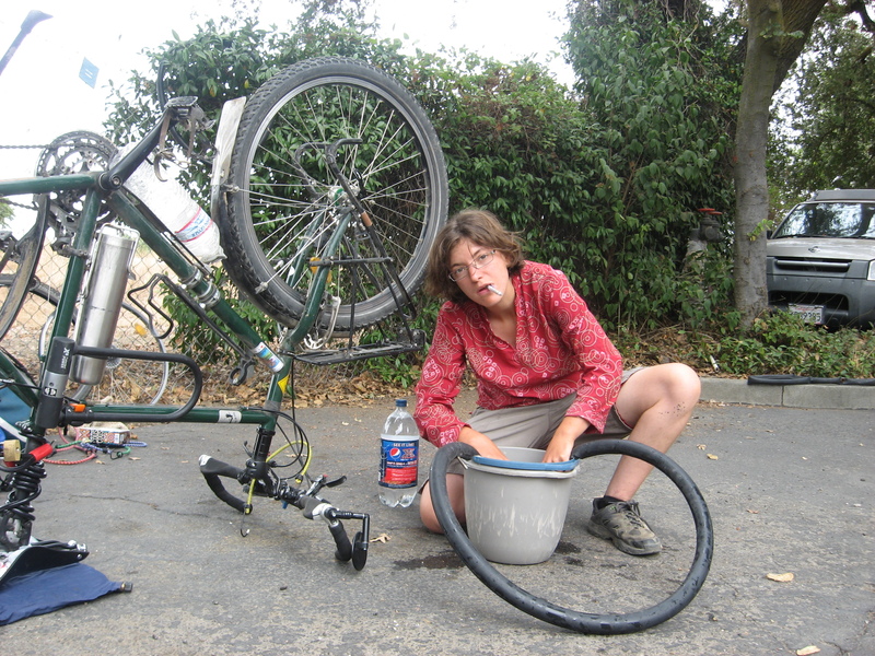 - Km 7609: 6. Platten bei Alena und 7. Platten bei Hardy (beide hinten), wir kaufen einen Ersatzschlauch, neue Flicken und Einlegebaender fur die Reifen beim Walmart