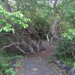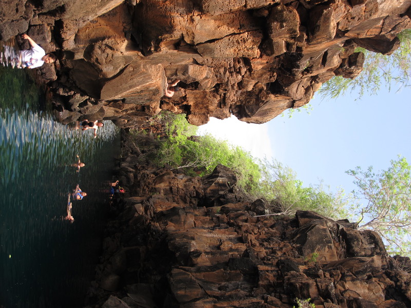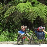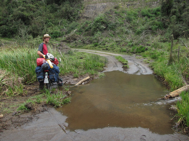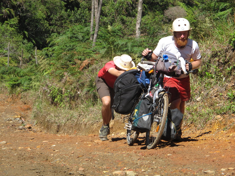 Laut Dorfbewohner soll es nur runter gehen und auch nur asphaltiert sein. Beide Aussagen stimmen nicht so ganz, ebenso wenig die Kilometerangaben zu den folgenden Orten. Kurze deftige Steigungen, Sand und loser Schotter lassen uns langsam voran kommen. Dafür radeln wir durch schönsten Eukalyptuswald mit Bächlein durchsetzt. Wenn es die richtige Tageszeit wäre, ließe sich hier sicher ein schnieker Zeltplatz finden.