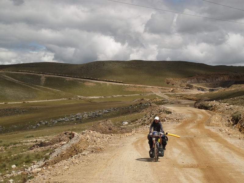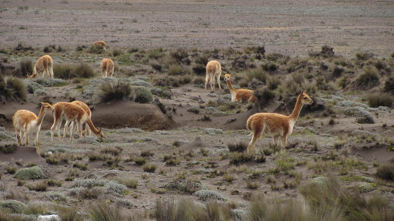 Nach einer Pissstrasse, treffen wir im Örtchen Santa Clara auf eine breit gefahrene Schotterpiste, die vor allem von dem vielen Minenarbeitern genutzt wird. Es geht in den ersten drei Stunden über diverse Pässe bis auf 3850m hinauf. Wir keuchen. Erschöpft schlingen wir im kalten Wind Brötchen, Kekse und heißen Kaffee hinunter. Die Landschaft ist karg und total zerfurcht. Überall sind Minenhalden auszumachen, die sich durch die Natur fressen. Riesige Berge bestehen oberflächlich nur noch aus losem Geröll, durch welches sich Wege ziehen. Wachmänner mit Gewehren bewachen die Zufahrten. In Einzäunungen befinden sich Vicuña-Herden. Wir passieren ein Nest mit Hütten aus Planen.