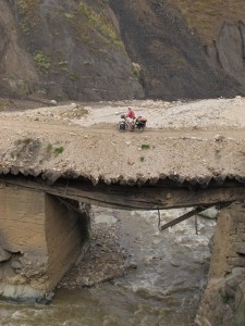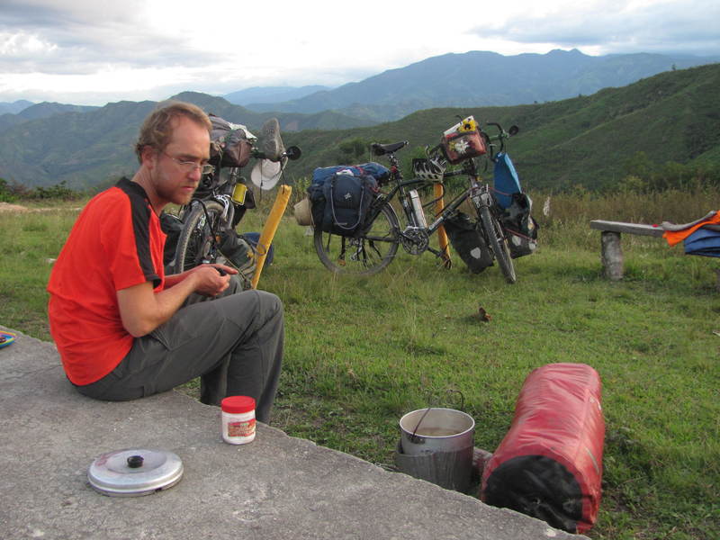 Durch Eukalyptuswald führt uns die Straße hinunter zum Fluss, den wir auf einer sehr abenteuerlichen Brücke überqueren. Wir müssen jetzt nur noch wieder hinauf, denn das auf dem Gipfel liegende Dorf Tulpo ist Ziel unserer Träume. Die Piste ist verdammt steil. Schieben ist mal wieder angesagt, insbesondere in den engen Kehren. Langsam arbeiten wir uns voran und erreichen nach einer weiteren Stunde gegen halb sechs Uhr abends endlich das Bergdorf. Werden aber schnell ernüchtert, denn hier ist auch der Hund begraben, es gibt kein Restaurant und kein Hotel. Der nette Direktor der Schule kommt extra herbeigelaufen, um uns einen Klassenraum aufzuschließen. Es ist warm hier und zieht auch nicht. Dankbar schieben wir mit müden Knochen die Räder hinter ihm her. Wir befinden uns nun in einem anderen Distrikt und sind positiv von dieser Schule überrascht. Eine Küche wird gerade gebaut, die Waschräume sind sauber und neu. Es gibt sogar Internet und Computer. Derweil ich flink den Kocher anschmeiße und Nudeln koche, kauft Hardy eine Sprite und kehrt stolz mit zwei Fleischspießen zurück. Fuß und Hals eines Huhns sind mit einem Schuss Mayo aufgespießt. Nach einem Biss mit Heißhunger entscheide ich jedoch, das dies echt ekelhaft schmeckt. Hardy verdrückt also auch meine Portion. Es bekommt ihm nicht allzu gut.