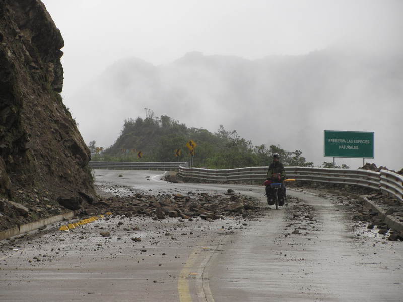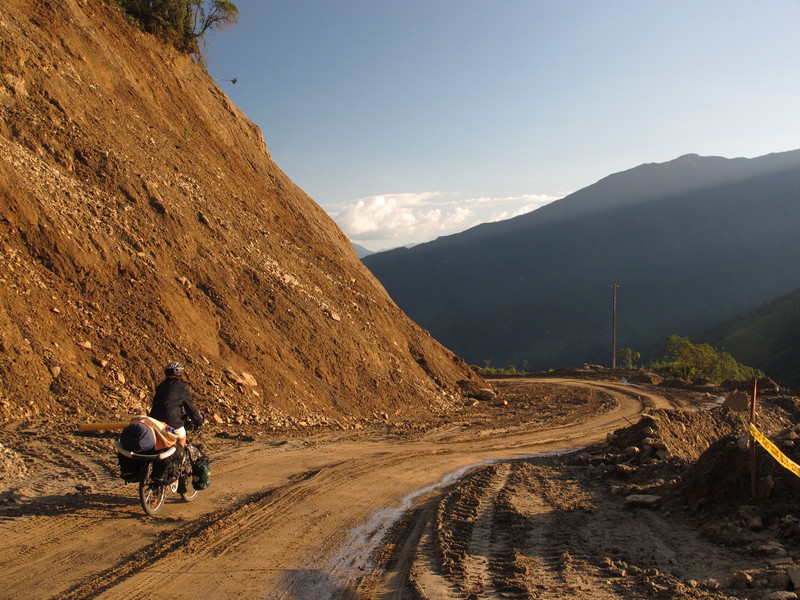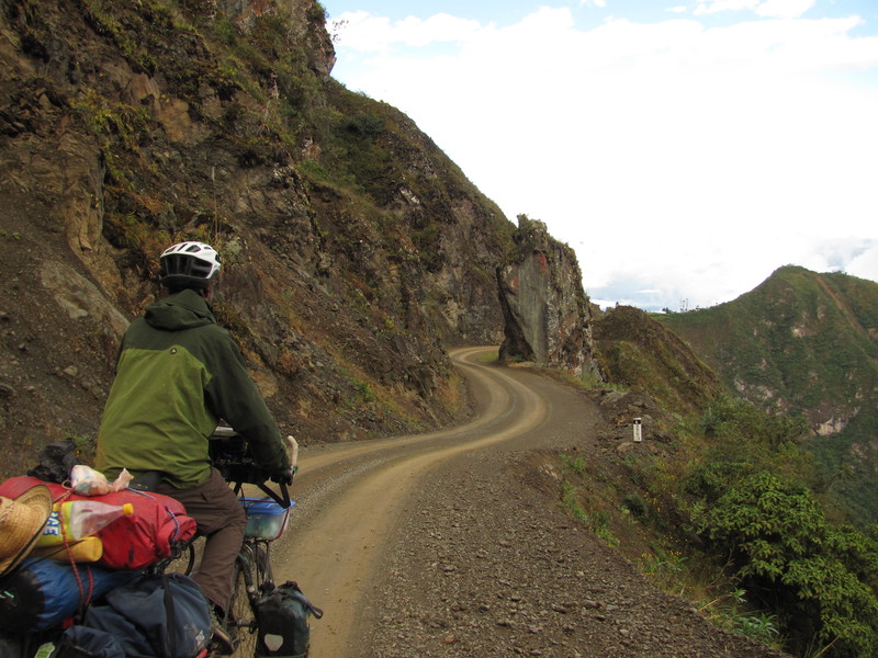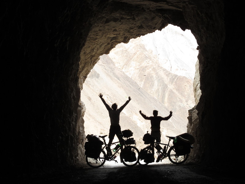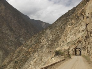 In den Fels sind diverse Tunnel gehauen, bestimmt 40 an der Zahl. Sie reichen von kleinen Bögen über der Piste bis hin zu langen Gängen, in denen es stockdunkel wird. In manchen Tunneln spenden Fenster im Gestein Lichtkegel. Im Dustern ist es trotz Stirnlampe komisch zu radeln. Bevor ein Auto hinein fährt hupen sie zum Glück immer, so wissen wir Bescheid uns warten zuvor. Einmal, wir sind mitten im Dunkeln, muss natürlich ein Fahrer, obwohl er unsererLichtkegel und Winken sieht auch hineinfahren und quetscht sich nah an uns vorbei. Wer bremst der verliert.