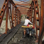 Auf sehr alten Brücken passieren auch wir dann und wann Zuflüsse. Lose, wackelige Bohlen bewegen sich unter uns, als wir lieber darüber schieben. Es klaffen große Löcher, durch die man das Wasser beobachten kann.