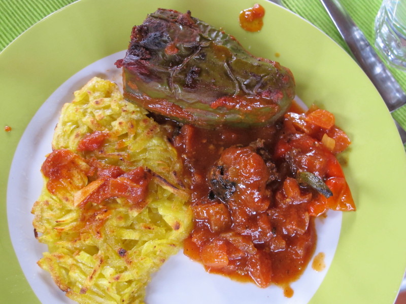 So treten wir in die Pedalen und erreichen am Nachmittag den sehr netten, ruhigen, kleinen Ort Caraz. Wir sind fertig. Die Glieder sind müde, wohl eine Folge des Durchrockens seit Cajamarca in einer Woche. Eigentlich hatten wir geplant in der Nachbarstadt Huaraz eine Pause einzulegen, bleiben aber hier, denn uns gefällt es sehr gut. Im sauberen Hotel San Marcos mit seinen schönen Innenhöfen quartieren wir uns ein. Nach einer Dusche geht’s ins Restaurant. Beide verschlingen wir ¼ Huhn mit Pommes und großem Salat. Heute gibt’s auch mal ein Bier.
