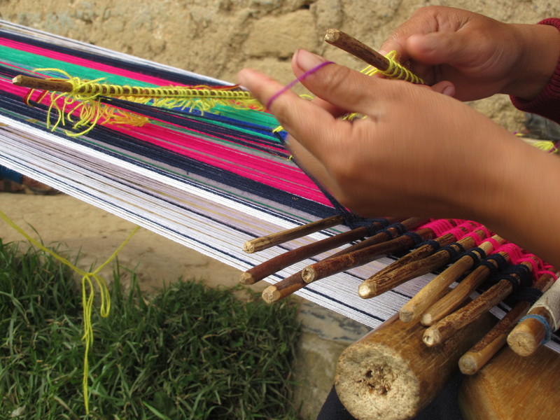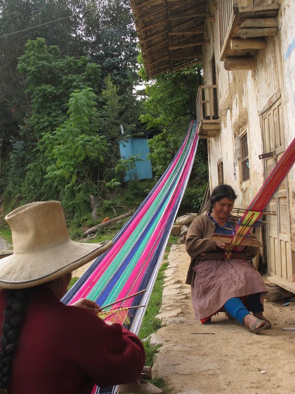 Auch werden hier viele Schafe gehalten. Deren Wolle spinnen die alten indigenen Frauen auch beim Laufen am Straßenrand auf einer Spindel zu einem dünnen Faden. Kunstvoll werden damit später Teppiche oder Taschen angefertigt. Wir halten vor einem Haus an, vor dem uns 20m lange gespannte bunte Fäden in die Augen fallen. Drei Frauen sitzen mit ihren Kindern davor, schwatzen und weben vergnügt dabei. Hardy ist überwältigt, er fragt, ob er näher kommen darf und gerät per Späßchen mit den Frauen ins Gespräch.