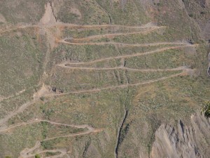 Schon während der Fahrt können wir in den Canyon herunter schauen und die vielen Kehren der an der sich gegenüberliegenden Wand befindenden Piste erkennen. Hardy zählt 24 an der Zahl. Wir überlegen ernsthaft diese Herausforderung nicht anzunehmen und die Steigung mit einem Bus zu überwinden, kommen aber von dem Plan ab, da erst wieder in vier Tagen einer fährt. Privater Verkehr passiert diese Strecke so gut wie nicht.