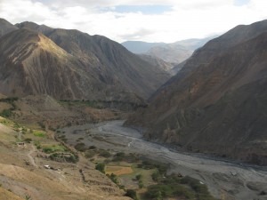 In ewigen, sich windenden Serpentinen geht es im Affentempo hinab in die Schlucht des Río Santa auf 700 Höhenmeter. Allein schon die Abfahrt ist gigantisch. Peru ist gewaltig in all seinen Facetten! Karge, Terrakotta-farbene Felswände türmen sich in den verschiedensten Verwerfungen auf. Dazwischen frisst sich der brodelnde Strom den Weg durchs Tal. Neben der Straße, die sich irgendwann natürlich wieder in Schotter verwandelt, geht es steil Meter tief hinab.