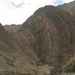 Ganz langsam öffnet sich die schmale Schlucht, die Wände verlieren an Steigungswinkel und ziehen sich sanft durch die Landschaft. In der Ferne können wir nun die richtig hohen Bergspitzen mit ihren schneebedeckten Gipfeln beobachten.