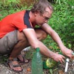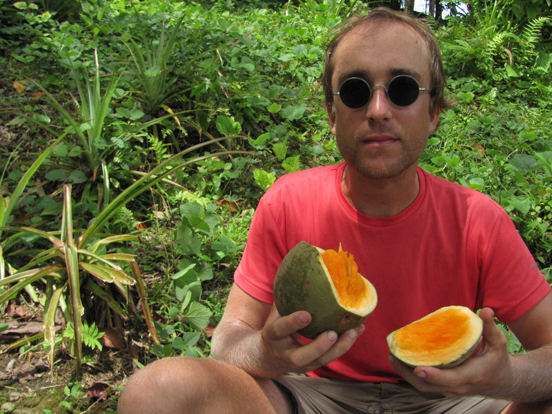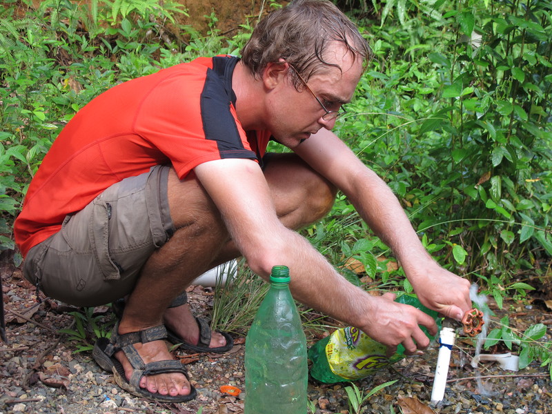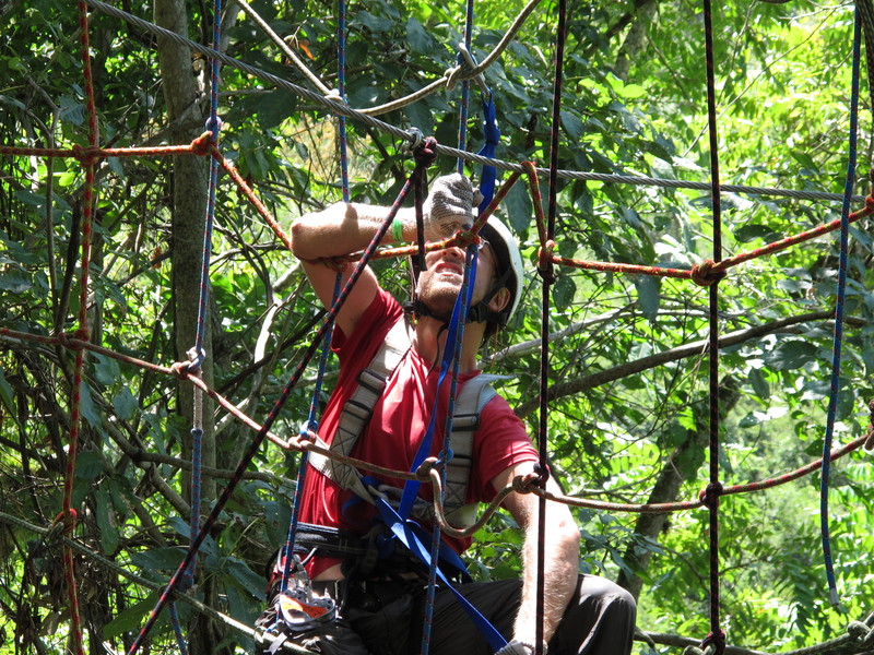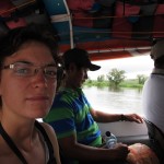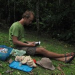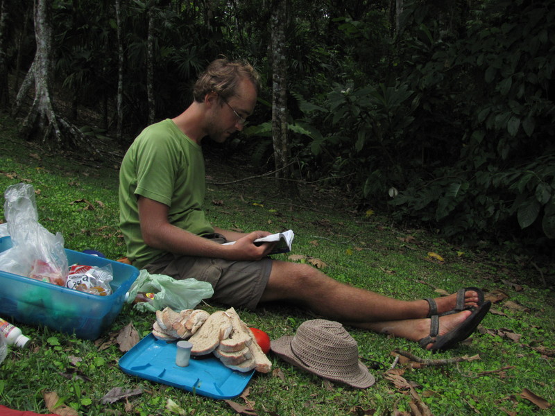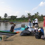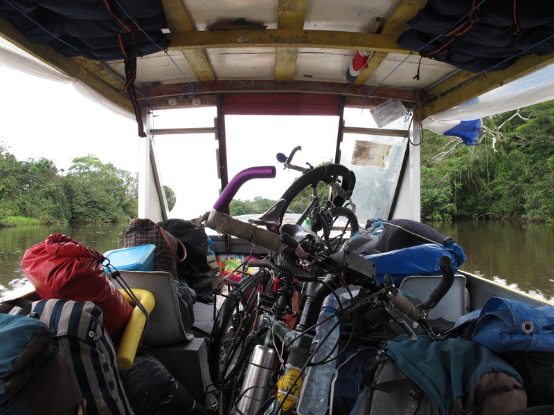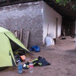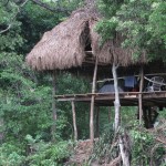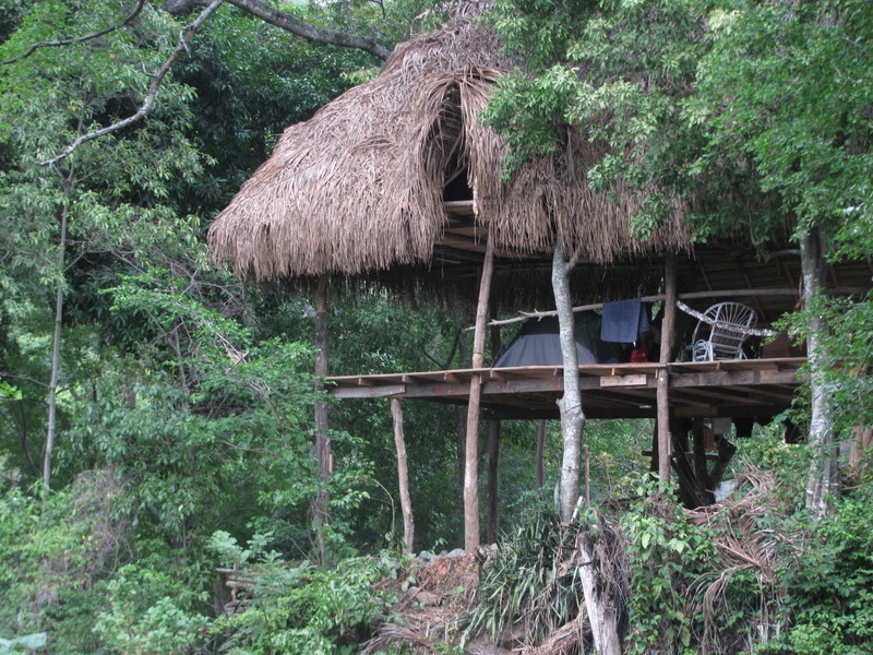 Die cabaña würde ich eher als ein gigantisch großes Baumhaus in Konstruktion beschreiben. Nebenan in einem alten Haus gibt es eine Dusche sowie ein Klo. Der Nachbar bewacht das Areal und baut die Hütte aus. Luís will das ganze als Hostal mit einer Bar direkt am Fluss ausbauen. Aber für uns, für uns ist es perfekt. Wir bauen unser Moskitoinnenzelt auf der Holzplattform mit Blick auf große Bäume, Bananenpflanzen und natürlich den Fluss auf. Hier oben weht eine frische Brise. Es dämmert bereits, schnell ist geduscht und es wird gekocht. Toll, unglaublich schön ist es hier. Und was am tollsten ist, wir haben das alles für uns. Wir sind allein. Kein Mensch ist hier, wir müssen mit niemandem reden. Das tut doch nach so einem anstrengenden Tag gut.