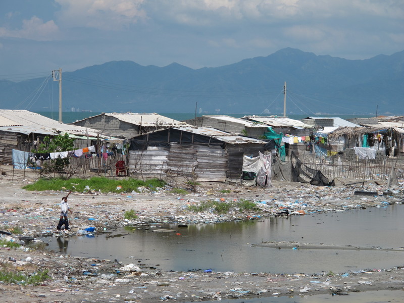 Natürlich musste das Ganze ja in schönster Gegend passieren. Uns umgeben jetzt schiefe Hütten, aus Brettern gebaut. Aus den Türspalten luken Gesichter hervor. Wir sehen all die großen Holzhandkarren, mit denen Männer durch die Straßen Bogotas ziehen, um Müll zu sammeln. Hier wohnen sie also.