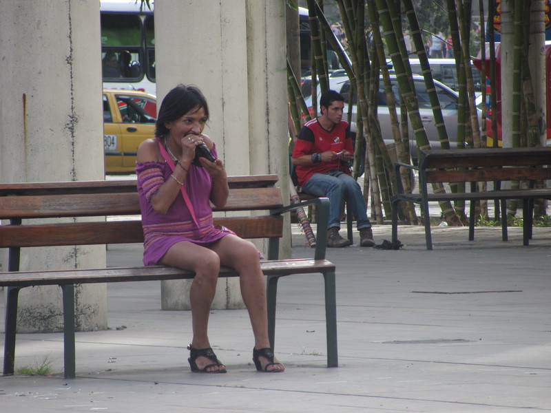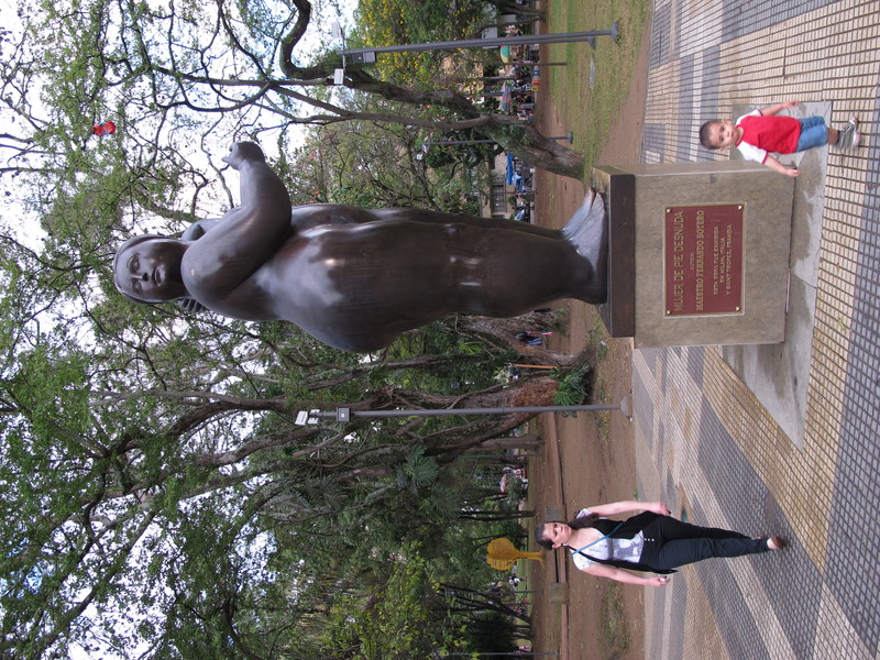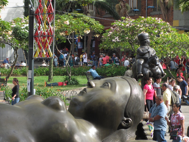 Nach ätzendem Stadtverkehr machen wir eine Pause auf der Plaza Botero vor dem Museo de Antioquia. Ganze 23 große, dicke Monumentalstatuen des berühmten Bildhauers Fernando Botero rühmen den Platz. Touristen lassen sich fotografieren, Verkäufer sind unterwegs aber auch viele, viele komische Gestalten. In solch einer geballten unangenehmen sowie stinkenden Fülle ist dies uns in Bogotá nicht aufgefallen. Viele Menschen hängen betrunken oder aus Tüten nach Kleber schniefend auf dem Platz herum oder schlafen auf der Straße. Hier ist es wärmer als im kalten Bogotá, hier ist das auf der Straßeleben eher möglich, denken wir.