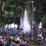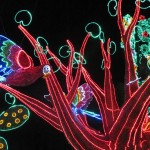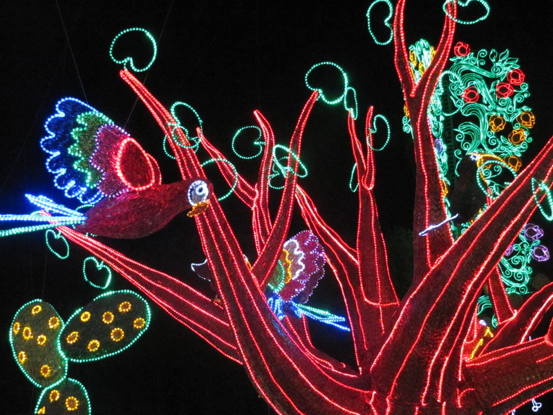 Es ist wirklich sagenhaft, so etwas habe ich noch nicht gesehen. Die Plätze und Parks sind mit bunten Blumen geschmückt. Figuren stehen herum, mit Lichterketten behangen. Alles wird in blau oder grün angestrahlt. Auf den Plätzen spielen Bands. Natürlich gibt es hier auch meine Lieblings-Plastikbäume, die hier in rot und violett leuchten. Aber der Hammer, das ist die Uferpromenade am Fluss! Auf Lichtpfosten werden Pflanzen und Bäume der verschiedenen Vegetationszonen Kolumbiens dargestellt. Es blitzt und blinkt und ist voll voller Menschen.