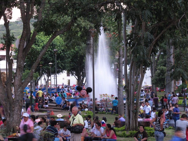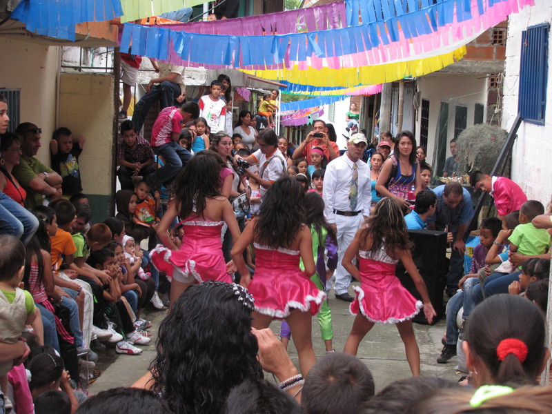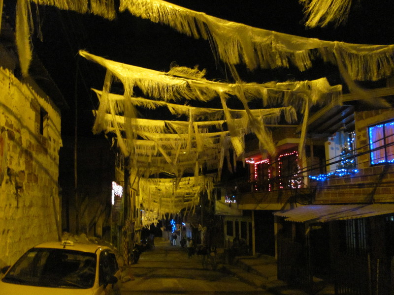 San Antonio de Prado ist hübsch weihnachtlich geschmückt. Auf der plaza hängen Lichtgirlanden in den Bäumen. Aus Reissäcken wurden Girlanden über die Straßen gespannt, die sanft im Wind hin und her wehen. Es gibt eine Tanzshow in knappen, pinken Kostümen auf der Bühne, in der die weiblichen Reize wie in amerikanischen Rapvideos zur Schau gestellt werden. Dann spielt eine kolumbianische Band, es gibt Jonglage.